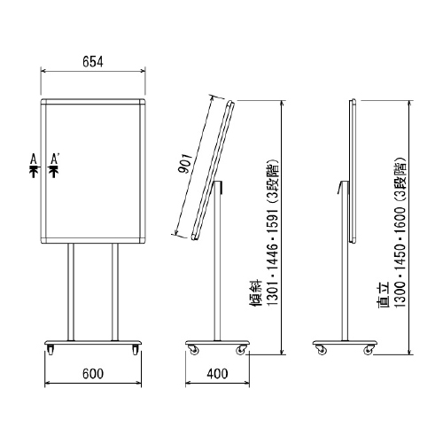 | 仕様 | 片面仕様 四辺開閉式 簡易防水仕様(屋外使用の場合は出力プリントは防水加工推奨) キャスター付き 傾斜・直立設置可能 高さ調節3段階 |