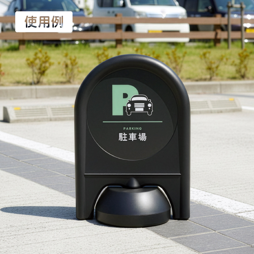 ブラックのコンパクトな樹脂スタンドに当店オリジナルの一目で伝わるピクトグラム「バイク駐車場」を組み合わせました。