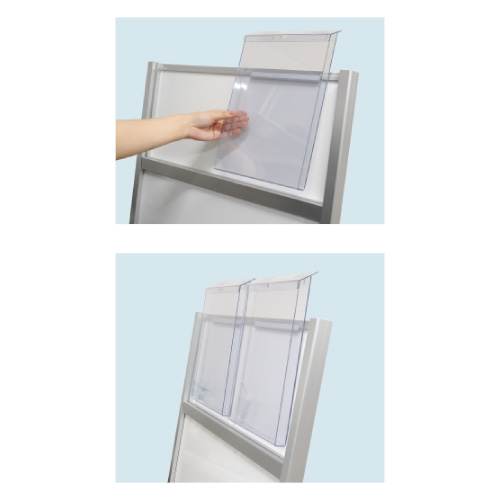 上下2辺が開くポスター看板です!フレーム下部にポスターがしっかり乗り、サイドの引っ掛かりでポスターが固定されるため、入れ替えやすさもばっちりです♪さらに、A4サイズのカタログがぴったり入る、雨を防ぐフタ付ケースも付属しています。(防水仕様ではありません)ケースの取り付けは、本体レールにひっかけるだけでOK!