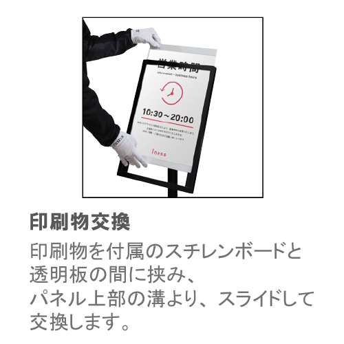「PHポールサイン PH-214」は、A4タテの印刷物を付属の透明カバーにはさみこみ、パネル上部の溝から抜き差し可能なポスタースタンドです。A4ヨコに対応した「PHポールサイン PH-224」もあり、フードコートなどでよく見かけます。