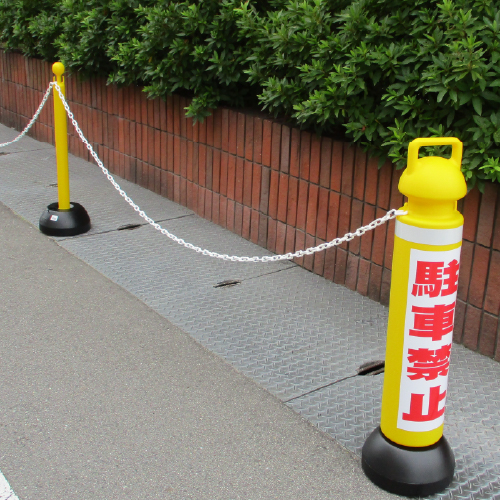 樹脂スタンドは、主に駐車場や駐輪場、工事現場など車や自転車、通行人が行き来する場所で案内や誘導を目的として設置されることが多く、一目見て目立つ色(イエロー、レッド、グリーンなど)の商品が多くラインナップされています。