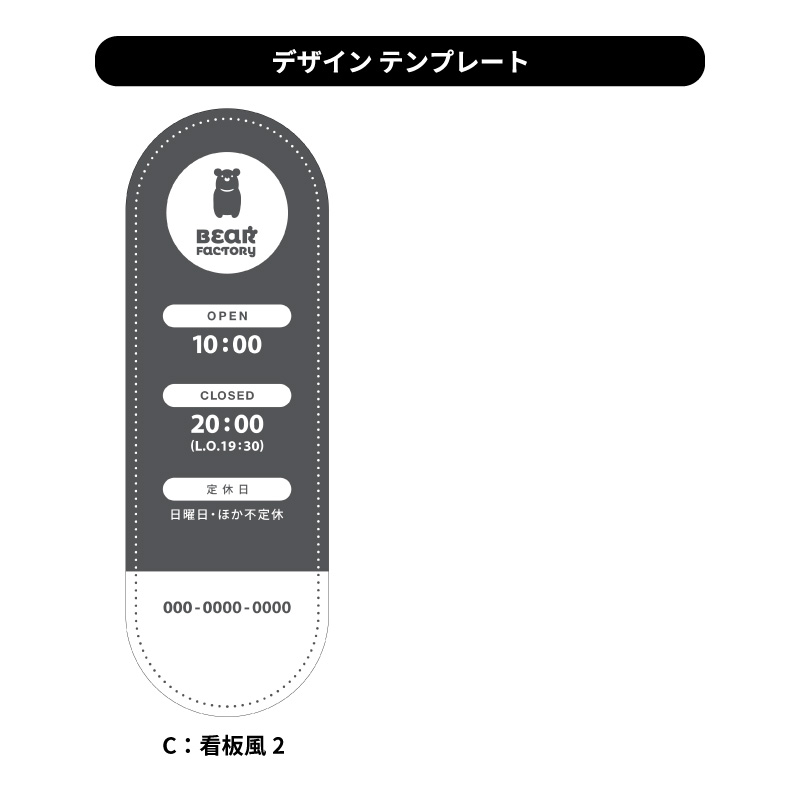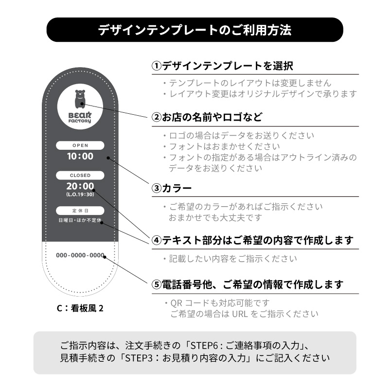 | 備考 | <デザインテンプレートをご選択いただいた場合> ・店舗名のロゴがある場合は御支給ください。 ・表示したい内容(お名前、営業時間、定休日など)をご明記ください。 ・詳細のご指示は、注文手続きの「STEP6 : ご連絡事項の入力」にご記載ください。 |