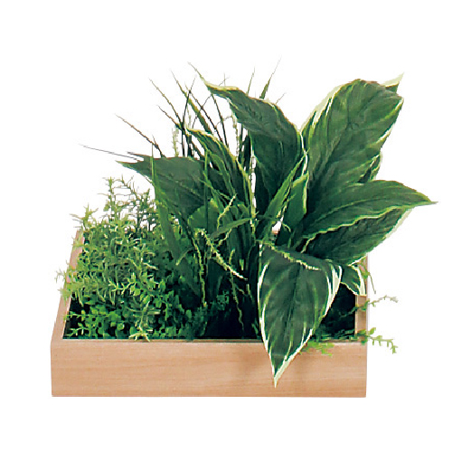 木目の薄型プランターがおしゃれなフェイクグリーンです。
