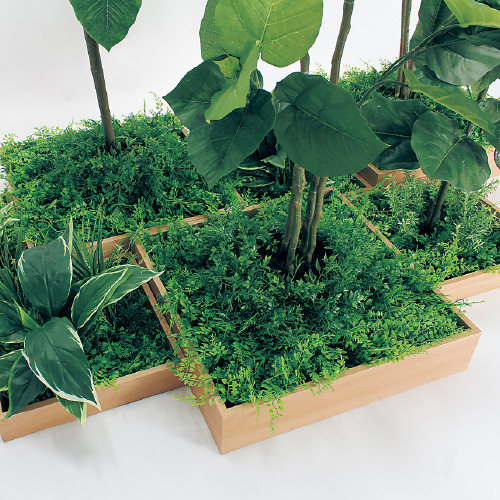 木目の薄型プランターがおしゃれな連接タイプの人工樹木です。