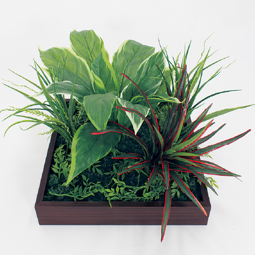 落ち着いた色味の木目がおしゃれなフェイクグリーンプランターです。