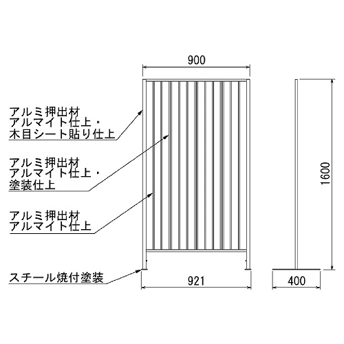 | 材質 | 本体:アルミ押出材木目シート貼り仕上・アルミ押出材塗装仕上・アルミ押出材シルバーアルマイト仕上 脚:スチール焼付塗装 装飾:造花 |