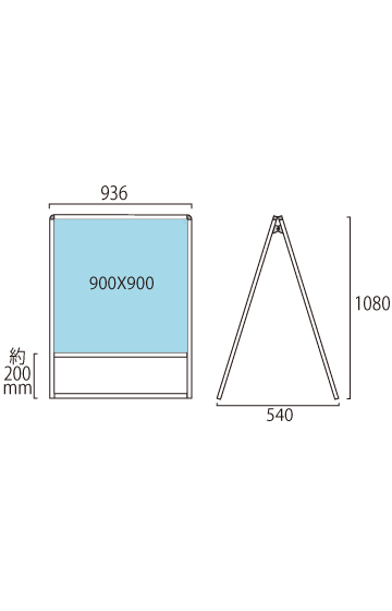 面板サイズは900×900mmで両面仕様、フレーム色はシルバー。掲示内容の差し替えも簡単で、店舗前やイベント会場での案内や告知に最適です。